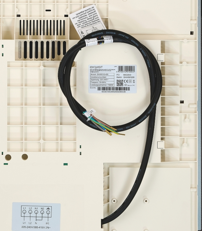 Auch an Sicherheit ist gedacht: Das Kochfeld verfügt über Restwärmeanzeige, Überhitzungsschutz sowie Sicherheitsabschaltung und automatische Abschaltung. Eine Kindersicherung sorgt zusätzlich für mehr Ruhe im Familienalltag. Der digitale Timer rundet die komfortable Ausstattung ab. Betrieben wird das Kochfeld mit 380–415 V~ / 50–60 Hz bei einer Leistungsaufnahme von 7360 W; das Gerätegewicht liegt bei 8,9 kg brutto und 8,1 kg netto.