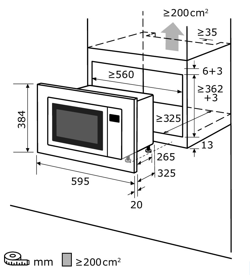 Die Installation gestaltet sich besonders flexibel: Mit einer Gerätehöhe von 38,4 cm, einer Breite von 59,5 cm und einer Tiefe von 36,6 cm passt die Mikrowelle in viele Küchenschränke ab einer Einbautiefe von 32,5 cm. Das umfangreiche Zubehör, bestehend aus Drehring, Glas-Drehteller und Grillrost, steht stets bereit.